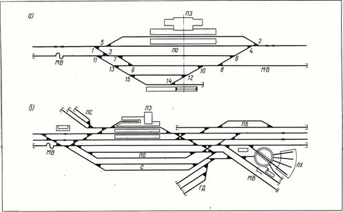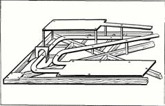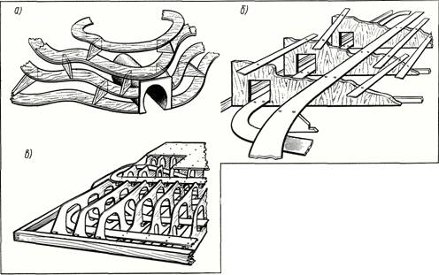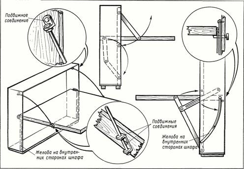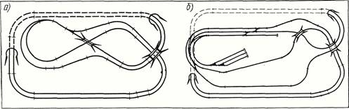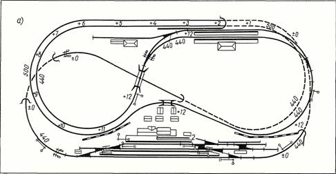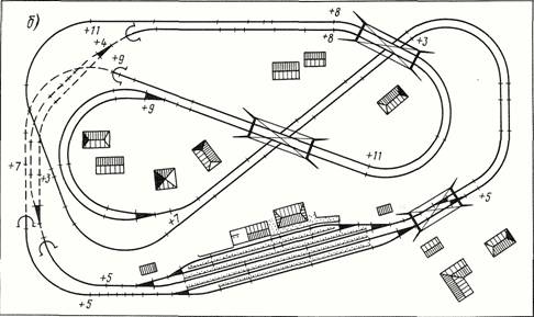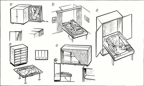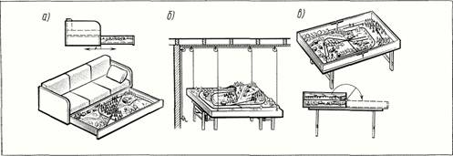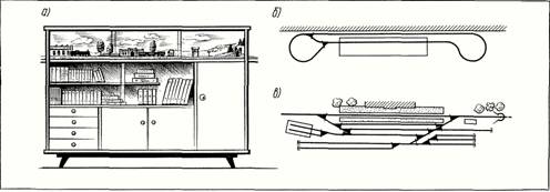 Глава II ПОСТРОЕНИЕ МАКЕТА ЖЕЛЕЗНОЙ ДОРОГИ 1. Условия размещения макета Моделист начинается во многих из нас с того момента, когда куплен первый комплект миниатюрной железной дороги. Поезд, как настоящий, движется по рельсам, а вслед за ним и наше воображение: мерцают огни светофоров, видится здание вокзала и хорошо знакомая железнодорожная атмосфера... Постепенно, но настойчиво фантазия оформляется в окончательное решение — соединить этот миниатюрный поезд со станционными постройками, пейзажем, рельефом местности и т. д. на небольшой стационарной установке — макете. Постройка макета железной дороги — кропотливая работа, связанная с определёнными трудностями, одна из которых возникает сразу, как только у любителя появилась мысль соорудить его. Ведь устроить макет надо в таком месте, чтобы не стеснить привычной жизни, сложившейся дома. Наиболее полно может отвечать интересам любителя макет, на котором будут расположены достаточно длинные пути между станциями, а станции иметь путевое развитие. Такой макет позволит воспроизвести движение грузовых и пассажирских поездов, а также одновременно и независимо от их следования производить маневры на станциях. Приступая к постройке макета железной дороги, каждый моделист должен принять в качестве обязательных требования, соблюдение которых обеспечит наиболее безотказную его работу и сохранность. Эти требования таковы. Место, куда будет убираться макет, должно быть сухим, без химических выделений, защищенным от пыли и солнечных лучей; изменение температуры окружающей среды не должно превышать 4 — 5°C. Желательно, чтобы весь макет убирался в одно место и был обеспечен удобный к нему доступ. Удобно хранить макет между большим шкафом и стеной комнаты. Отодвинув шкаф от стены на 250 мм (это расстояние следует считать минимальным) и установив вверху между шкафом и стеной ограничительные бруски, можно получить пространство, хорошо защищенное от воздействия случайных толчков, излишнего света. На бруски и часть шкафа сверху можно положить фанерный щит, а проёмы по бокам закрыть занавесками, которые должны хорошо сочетаться с окружающей обстановкой и цветом стен. Таким образом, получается защищенное от пыли и посторонних воздействий пространство, которое относительно легко скроется в интерьере (рис. 13, а). После этого можно приступать к сборке рамы подмакетника, одновременно решив способ выдвижения макета из-за шкафа и перевода в горизонтальное рабочее положение. В вертикальном положении макет можно устанавливать на невысокую, длинную платформу на роликах и на ней выкатывать из-за шкафа и также убирать его обратно. В рабочем положении макет можно устанавливать на раздвижном столе, на откидных или привинчивающихся опорах, одну сторону рамы подмакетника можно подвешивать на закреплённые в стене крюки. При такой схеме размещения рама подмакетника должна быть жёстко собрана, не давать перекосов во время перемещения, иначе все рельсовые, электрические соединения, швы рельефа быстро придут в негодное состояние. Убирая макет, его следует закрывать полиэтиленовой плёнкой для защиты от проникновения пыли, которая нарушает токосъём с рельсов и портит общий вид макета. Рис. 13. Схемы размещения макета: а — за шкафом; б — убираемого в шкаф; в — в стенной нише; г — откидной в специальном шкафу;