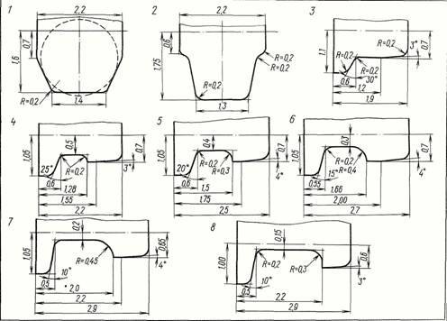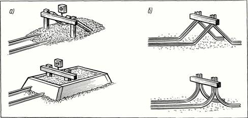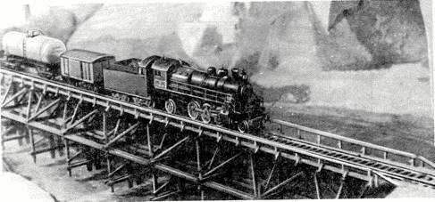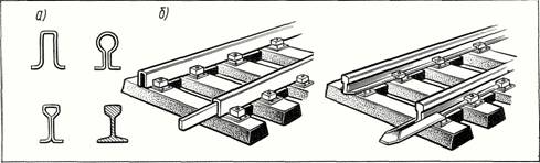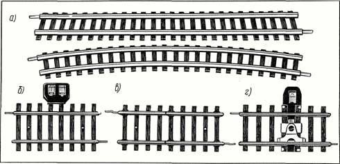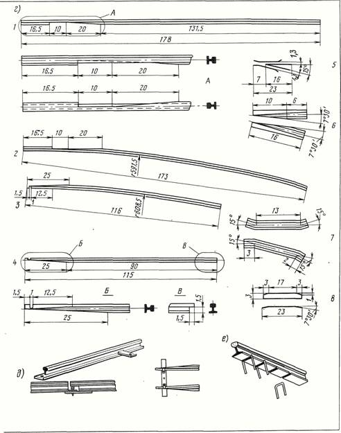 ГЛАВА III ЖЕЛЕЗНОДОРОЖНЫЙ ПУТЬ И ИНЖЕНЕРНЫЕ СООРУЖЕНИЯ НА МАКЕТАХ 1. Элементы железнодорожного пути Железнодорожный путь, представляющий собой комплекс инженерных сооружений и устройств, предназначенных для обеспечения движения поездов, состоит из верхнего и нижнего строения. К верхнему строению относятся рельсы, скрепления, стрелочные переводы, шпалы, балласт, к нижнему — земляное полотно и искусственные сооружения. Рельсы непосредственно воспринимают нагрузку колёс подвижного состава, они имеют профиль двутавра, который наиболее целесообразен при работе на изгиб. Ширина рельсовой колеи — расстояние между внутренними гранями головок рельсов на прямых участках железных дорог СССР — принята равной 1520 мм. Рельсы крепят к шпалам промежуточными скреплениями, которые сохраняют установленную ширину колеи, не допускают опрокидывания и продольного смещения рельсовых нитей. Стыковые соединения соединяют рельсы в непрерывную и прочную нить, места такого соединения называют рельсовыми стыками. Шпалы служат для крепления рельсов, передачи давления от них на балластный слой, сохранения установленной ширины колеи и обеспечения устойчивости рельсового пути, Для равномерной передачи давления от шпал на земляное полотно служит балластный слой. Он смягчает удары колёс о рельсы, способствует удалению воды от верхнего строения пути и препятствует перемещению шпал. Основными материалами для балласта служат щебень и карьерный гравий. На макетах железных дорог конструкция верхнего строения пути значительно упрощена. Международными нормами установлена ширина колеи — 9; 12; 16,5; 32 и 45 мм, что соответствует определённому масштабу модели железной дороги. Предприятия, изготавливающие модели железных дорог, делают звенья железнодорожного пути различной длины, для прямых и кривых участков, рельсы, шпальную решётку, стрелочные переводы, глухие пересечения, тупиковые упоры, элементы инженерных сооружений и др. Звенья пути (рис. 38, а) состоят из шпальной решётки, соединенной с рельсами. Шпальную решётку обычно изготавливают из пластмассы, она служит изолятором для рельсовых нитей, по которым проходит электрический ток для питания электродвигателей моделей локомотивов. Для подведения к рельсам электрического тока служат специальные звенья пути с выносными контактами (рис. 38, б). Кроме того, изготавливают звенья с изолирующими вставками (разрывами) на одной или двух рельсовых нитях (рис. 38, в), с рельсовой педалью (контактом, рис. 38, г), подающей сигнал о прохождении поезда. Особенности применения этих элементов рассмотрены в главе V. Рис. 38. Звенья железнодорожного пути в масштабе 1:87: а — прямые и кривые; б — с токоподводящими контактами; в — с изолирующими вставками (разрывами); г — с рельсовой педалью (контактом) Рельсы изготавливают из жести, меди, латуни методом штамповки, прокатыванием или протягиванием. В зависимости от технологии изготовления рельсы бывают различных профилей (рис. 39, а), поэтому различают способы крепления рельсов к шпальной решётке и стыковые соединения звеньев пути (рис. 39, б). Последние должны обеспечивать надёжный контакт и минимальное сопротивление электрическому току. Во избежание схода подвижного состава с рельсов в стыках недопустимы вертикальные или горизонтальные смещения рельсов относительно друг друга. 