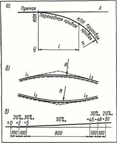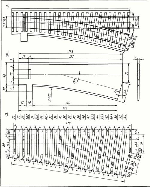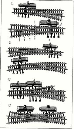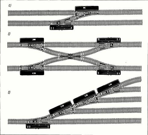 Следует учесть, что на макетах, где будут двигаться локомотивы с большей жёсткой базой (пять и более осей в одной раме) и поезда большой длины (40 — 50 вагонов), во избежание схода подвижного состава с рельсов минимальные радиусы кривых следует увеличивать в 1,5 — 2 раза, а сопряжение кривых участков пути с прямыми для облегчения плавного вписывания подвижного состава необходимо осуществлять при помощи переходных кривых, радиус которых постепенно уменьшается от бесконечности до величины радиуса кривой (рис. 47, a). Ось переходной кривой можно построить, пользуясь уравнением кубической параболы: где С — коэффициент пропорциональности, называемый параметром, переходной кривой; C = Rl; при этом l ? R. Рис. 47. Элементы плана и профиля железнодорожного пути: а — схема переходной кривой; НПК — начало переходной кривой; КПК — конец переходной кривой; б — сопряжение элементов профиля; в — профиль наклонного участка Переходные кривые можно сделать из готовых рельсовых звеньев, если их шпальные решётки изготовлены из эластичной пластмассы. Для этого на шпальной решётке разрезают междушпальные крепления под наружной рельсовой нитью и скреплённые между собой звенья изгибают по шаблону, сделанному из фанеры или органического стекла толщиной 2 — 3 мм. При изготовлении шаблона на плоскости заготовки вычерчивают линию, соответствующую изгибу внутренней рельсовой нити, и по этой линии вырезают шаблон. Использование шаблонов из органического стекла, на которых нанесены оси прямых, кривых и стрелочных переводов, длина стандартных звеньев и др,, можно рекомендовать для вычерчивания всей рельсовой схемы макета. Продольный профиль пути состоит из плавно соединенных между собой отрезков различной крутизны. Крутизна наклона профиля пути характеризуется уклоном, представляющим отношение разности высот точек h, и расстоянием между ними l Уклоны пути i обозначают числовым значением со знаком ‰, например i = 5‰ (пять тысячных) или десятичной дробью — 0,005. В зависимости от направления движения поезда наклонный участок будет подъёмом или спуском. Наибольший уклон пути на модельной железной дороге рекомендуется принимать не более 50‰, так как при большей крутизне наклонного участка возникает опасность схода поезда с рельсов, а при движении на подъём — большое сопротивление движению. Во избежание самопроизвольного расцепления вагонов и схода поезда с рельсов на макете не допускаются переломы профиля пути. Сопрягаемые элементы профиля (подъёмы и спуски) соединяют круговыми кривыми, а при малой разности сопрягаемых элементов устраивают горизонтальные площадки (рис. 47, б). Устройство прямых на горизонтальных площадках обязательно между сопряжениями спусков (подъёмов) с кривыми участками пути в горизонтальной плоскости. Горизонтальные участки пути — площадки — соединяют с наклонными участками отрезками меньшей крутизны или круговыми кривыми (рис. 47, в). Для правильного сопряжения элементов профиля укладку путей проверяют шаблонами. 3. Конструкция стрелочных переводов Стрелочные переводы в зависимости от назначения и конструкции подразделяют на одиночные, двойные и перекрёстные. Одиночные стрелочные переводы (рис. 48, а) служат для соединения двух путей; они могут быть право- или левосторонними и применяют их при отклонении бокового пути от прямого в