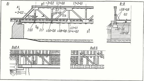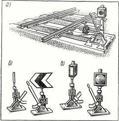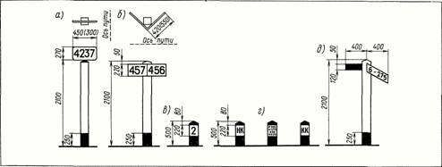 Рис. 63. Портал из бетона однопутного тоннеля Для укрепления откосов и насыпей, удержания грунта от оползания устраивают подпорные стенки (рис. 64) из камня или железобетона. Эти сооружения часто воспроизводят на макетах железной дороги, так как на ограниченной площади бывает трудно разместить высокую насыпь или глубокую выемку полного профиля, поэтому вместо откоса устанавливают подпорную стенку. Рис. 64. Подпорные стенки: а — насыпи; б — выемки; 1 — стенка; 2 — земляное полотно 5. Путевые знаки Одним из элементов, существенно дополняющим эффект правдоподобности, создаваемый макетом железной дороги, являются путевые знаки. Правильно расставленные на обочине железнодорожного полотна путевые знаки значительно оживляют макет. Как и в настоящей железной дороге, каждому знаку должно соответствовать свое, строго определённое место. Путевые знаки устанавливают с правой стороны пути по счёту километров на расстоянии не менее 2 м от крайнего рельса. На макете это расстояние соответственно уменьшают. Километровый знак (рис. 65) указывает границы километров. С одной стороны километрового знака указывают номер окончившегося километра, а с другой — номер километра, начинающегося за знаком. На макете эти знаки можно устанавливать через какое-то условное, но обязательно одинаковое расстояние, например, в масштабе 1:87 через 4 — 5 м. Рис. 65. Путевые знаки: а, б — километровые знаки; в — пикетный знак; г — знаки начала и конца кривой; д — уклоноуказательный знак Пикетный знак делит километр на 10 частей и устанавливают его между километровыми знаками через 100 м. Порядковые номера пикетов изображают на двух противоположных сторонах, перпендикулярных оси пути, с одной стороны — номер окончившегося пикета, с противоположной стороны — начинающегося за знаком. В начале кривой устанавливают знак с надписью НК (начало кривой), в середине — знак с характеристиками кривой (радиус — R , длина кривой — К , возвышение наружного рельса — В и ширина колеи в кривой — ШК), а в конце кривой — знак с надписью КК (конец кривой). Уклоноуказательный знак1 устанавливали в местах перелома продольного профиля. Положение таблички указывает характер впередилежащего элемента профиля (уклон, подъём, площадка), а цифры — крутизну элемента в тысячных и его протяжённость. Технология изготовления путевых знаков та же, что и при изготовлении сигнальных знаков (см. главу IV). Примечания:1 В настоящее время уклоноуказательные знаки не устанавливают. |