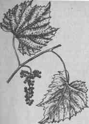 Рис. 13. Vitis vulpina L. (=V. riparia Michx.). V. vulpina L.= V. riparia Michx. (В. вульпина = В. рипариа, рис. 13). Распространен в восточной части Северной Америки — от северных районов Канады до южных штатов США (Техас и Колорадо). Произрастает по берегам рек Миссисипи и Миссури в тенистых лесах на плодородных, с высоким содержанием гумуса легких воздухопроницаемых песчаных и глинисто-песчаных почвах с небольшим (до 10–15%) количеством растворимых форм извести. При более высоком содержании извести заболевает хлорозом. Характеризуется высокой морозоустойчивостью (до —30°C). Не поражается грибными болезнями, устойчив к корневой форме филлоксеры. От скрещивания V. vulpina и V. labrusca получено много сортов гибридов — прямых производителей. V. vulpina используют в селекции главным образом для получения филлоксероустойчивых подвоев. Из сортов этого вида наибольшее практическое применение получили Рипариа Глуар де Монпелье (Рипариа Глуар), Рипариа Гран Глабр, а также гибрид Солонис Х Рипариа 1616 и др.