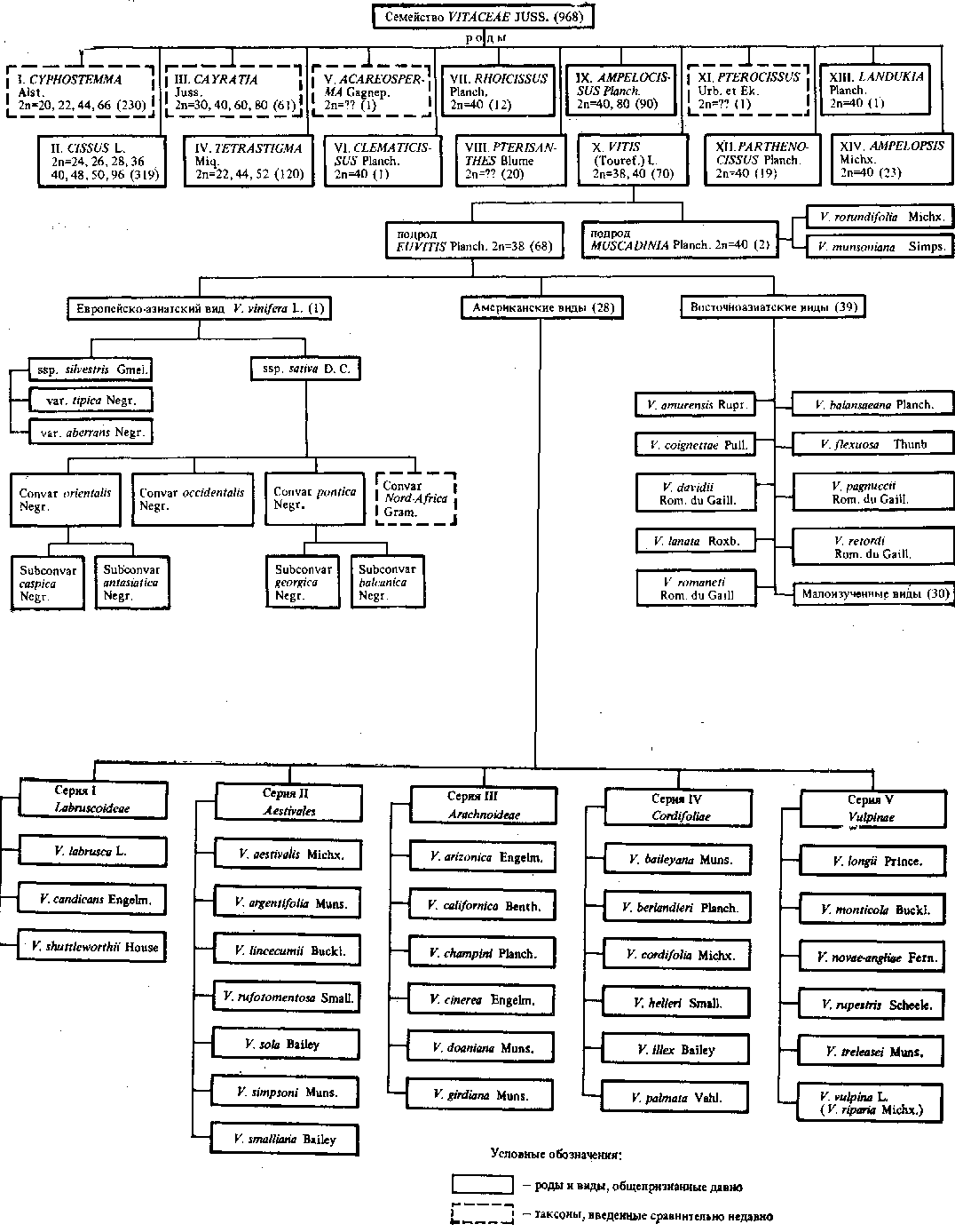1 Классификация семействаVitaceae Juss. — ВИНОГРАДОВЫЕСогласно современной систематике растений виноград принадлежит к сравнительно небольшому семейству Vitaceae Juss. — Виноградовые, объединяющему 14 родов и 968 видов (Топалэ, 1983). Семейство Виноградовые относится к типу покрытосеменных растений Magnoliophyta (Angiospermae), классу Двудольные Magnoliatae (Dicotyledones), порядку Rhamnales Lindley (Тахтаджян, 1966). В порядок Rhamnales входят также семейства Rhamnaceae и Leeaceae, с которыми Виноградовые имеют родственные связи. По предположению ученых палеонтологов (Криштофович, 1938; Палибин, 1946), первые представители семейства Vitaceae появились на границе юры и мела, однако наиболее активно формообразовательный процесс проходил в третичном периоде и уже к концу плиоцена и в постплиоцене развилось большое разнообразие форм этого семейства. В своем историческом развитии растения семейства Vitaceae первоначально распространились в тропической и субтропической зонах Африки и Азии, где и в настоящее время сохранилось большое разнообразие видов винограда. Из первичного центра видообразования еще до разделения материков происходила миграция видов в тропические и субтропические зоны Америки, Австралии и Европы. Ранее в семейство Vitaceae Juss. входило подсемейство Leeoideae Clarke, однако по предложению систематиков (Suessenguth, 1953; Тахтаджян, 1966) это подсемейство было исключено и выделено в самостоятельное семейство — Leeaceae Dumortier. В настоящее время представители семейства Vitaceae в диком виде произрастают во влажных местах по долинам и склонам гор в районах тропического, субтропического и умеренно теплого климата между 52° с. ш. и 43° ю. ш. Это многолетние с мощным стволом лазящие древесные лианы, реже прямостоячие кустарники и низкие деревья с мясистыми удлиненными мочковатыми, реже утолщенными корнями, с опадающей, как у представителей родов Vitis, Ampelopsis либо Partenocissus, или неопадающей, как у представителей родов Cissus, Tetrastigma и других, листвой. Однолетние побеги с длинными междоузлиями, несколько утолщенными на узлах, на которых в супротивно-чередующемся порядке располагаются листья. Последние большей частью простые, реже сложные, разнообразной формы, цельные, рассеченно-лопастные, пальчато-рассеченные или перистые, с двумя опадающими прилистниками. У некоторых видов явно выражена разнолистность (гетерофилия) на одном растении и побеге. У большинства видов семейства Vitaceae побеги развиваются ежегодно из почек, закладывающихся в пазухах листьев, а у некоторых — из почек подземного утолщенного стебля. Для представителей семейства Vitaceae характерно 4 типа ветвления побегов, что отражает степень эволюции этого семейства: моноподиальное со спиральным расположением листьев; моноподиальное с очередным двухрядным расположением листьев; симподиальное без усиков с образованием бокового соцветия; симподиальное с усиками. У видов рода Cissus встречаются все 4 типа ветвления, Атреlopsis, Rhoicissus и Ampelocissus — только третий и четвертый, у остальных родов — только четвертый тип ветвления. Растения прикрепляются к опоре, обвивая ее, или присасываются к ней с помощью присосков, находящихся у некоторых видов на концах усиков. Соцветия многоцветковые, имеющие вид ложного зонтика или удлиненной метелки, реже кисти. Цветки мелкие, невзрачные, зеленоватые, обоеполые, мужские, женские, функционально-женские, полигамно однодомные или двудомн