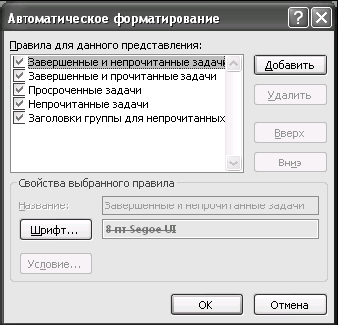 Теперь, чтобы отобрать все задачи, относящиеся к договорам, в меню «Текущее представление» на панели инструментов вместо стандартного представления «Простой список» выберите настроенное нами представление «Обзор договоров». Оно будет выглядеть так: ![]() Как создавать поля разных типов: цифровые, текстовые и «да/нет», мы знаем из предыдущего параграфа «Подготовка мероприятий». В «Задачах» они создаются точно так же. Предположим, у нас уже есть поля «Бухгалтерия», «Юридический отдел» и «Финансы» – это три службы, от которых необходимо получить визу на договор. Формат всех трех полей – «да/нет», то есть либо виза получена, либо еще нет. Научимся настройке автоматического выделения синим цветом тех договоров, по которым получены все необходимые согласования.