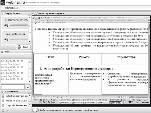 Глава 7. Успешное онлайн-мероприятиеТехническая инфраструктура Тонкости организации и проведения Режиссура мероприятий и создание «эффекта присутствия» ![]() За все в этой жизни нужно платить. Огромное удобство онлайн-мероприятий, экономия организационных расходов, устранение непроизводительных затрат времени – чтобы получить все эти выгоды, необходимо приложить определенные усилия. В некоторых аспектах подготовка онлайн-мероприятия сложнее, чем обычного. Главная трудность в организации онлайн-мероприятий – создать максимальный эффект присутствия, живого общения участников между собой и с выступающими. Для этого нужна тщательная режиссура, продуманность и вы-строенность всего, что вносит в мероприятие интерактивность и динамичность. Кроме того, ситуация с технической стороной онлайн-работы в нашей стране пока далеко не безоблачна. Недостаточная пропускная способность интернет-каналов и техническая грамотность людей, качество работы оборудования в компаниях – все это накладывает ограничения и обусловливает трудности. Ничего страшного в них нет, их нужно один раз как следует проработать – и в дальнейшем наслаждаться результатами. Типы онлайн-мероприятийРазделим онлайн-мероприятия на два основных типа: – чисто онлайновые: все общение происходит только в онлайне, никто не собирается в переговорных, конференц-залах и т. п.; – смешанные: значительная часть участников собрана вместе в оффлайне (например, в учебном классе проходит тренинг с трансляцией онлайн: менеджер по продажам из Москвы делает онлайн-презентацию для группы топ-менеджеров клиента в Томске). Специфика организации онлайн-мероприятия, естественно, зависит также от числа участников. По этому признаку будем выделять мероприятия: – малые – до трех-пяти участников; – средние – примерно до 10–15 участников; – большие – десятки, сотни, а иногда и тысячи участников. Последовательно пройдем по главным принципам организации таких мероприятий на простых жизненных примерах. «Переговоры с клиентом» (малое, онлайн)Малый «онлайновый» формат, переговоры один на один в онлайне с клиентом, деловым партнером, поставщиком – самое простое из возможных онлайн-мероприятий. Но даже в нем есть определенные тонкости, которые мы разберем. Техническая инфраструктура. Все, что нужно, – это интернет-канал от 256–512 килобит, веб-камеры и гарнитуры с обеих сторон, а также программа Скайп у обоих участников общения. Если потребуется демонстрация слайдов, рабочего стола – то созданное событие в более серьезном онлайн-решении (AdobeConnect, Вебинар. ру и т. п.). Свет. Для онлайн-общения важно позаботиться о том, чтобы лицо участника было хорошо освещено. Категорически не рекомендуется садиться спиной к окну: на экране вместо лица будет темный силуэт. Вообще свет должен падать на участника сбоку или спереди, но не сзади. Если расположение вашего рабочего места с точки зрения освещения неудачно (например, вы сидите спиной к окну, и с этим нельзя ничего сделать), можно подсветить лицо яркой настольной лампой. Ощущения будут не очень комфортные (вы почувствуете, за что получают свой хлеб с маслом звезды телеэкрана), но зато на экране компьютера клиента ваше лицо будет видно вполне отчетливо. Звук. Крайне желательно применять гарнитуру. Если вы работаете с ноутбука, то можно воспользоваться е