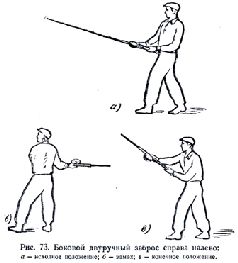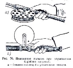 2. ЗАБРОС Спиннинговый заброс должен быть далеким, точным и наименее утомительным для рыболова. Существует много разнообразных приемов как двуручного, так и одноручного заброса. Но в настоящее время опыт, накопленный спиннингистами, и детальное изучение техники заброса на площадке позволяют рекомендовать ограниченное число определенных приемов заброса. При любом приеме важен выбор угла к поверхности воды, под которым следует забрасывать. Решить этот вопрос теоретически трудно, так как грузило и приманка имеют неопределенную форму, их полет не свободен, а тормозится сопротивлением воздуха и лесой, сматывающейся с катушки. Сопоставление различных по форме траекторий полета грузила и приманки с дальностью их падения показало, что наиболее далекий заброс получается тогда, когда угол их входа в воду близок к 90". Такая траектория полета получается при забросе в тихую погоду под углом от 45 до 55° к поверхности воды; при этом чем большее сопротивление имеют грузило и приманка в полете, тем под большим углом их следует забрасывать. Существенное значение имеет путь, который проходит конец удилища в забросе. Для достижения наибольшей дальности заброса кривая, описываемая концом удилища с момента начала посыла до момента «отрыва» грузила, должна лежать в плоскости, наклонной к горизонту, под тем же углом, под которым производится заброс, т. е. траектория полета грузила должна являться как бы продолжением траектории движения тюльпана. Такое движение удилища позволяет полнее использовать прилагаемое к нему усилие, чтобы придать грузилу наибольшую начальную скорость и создать наивыгоднейший угол между лесой и удилищем — около 90°. Играет роль также длина пути, который проходит конец удилища в забросе. Чем больше путь, тем легче достигнуть плавного наращения скорости движения конца удилища и наибольшей начальной скорости грузила. Эти весьма важные обстоятельства должны быть приняты во внимание при выборе приема заброса. Необходимо учитывать и удобство торможения барабана катушки. Нельзя рекомендовать такие приемы заброса, при которых приходится тормозить барабан по одной из внутренних его сторон, так как в моменты вспухания леса будет больно бить по пальцам забрасывающего. Кроме того, она может захлестнуться за палец и оборваться. Не следует тормозить по торцу переднего диска барабана, поскольку маленькая площадь соприкосновения не позволяет правильно оттормозить катушку, а при большой скорости вращения возможен даже ожог тормозящего пальца. Поэтому единственно правильным следует считать торможение большим или указательным пальцем правой руки по краю плоскости переднего диска барабана (рис. 70,б). При боковом забросе отпускать барабан катушки следует в тот момент, когда направление полета приманки совпадает с выбранным направлением заброса, а при вертикальном — когда траектория полета приманки наиболее выгодна для дальнего заброса. Указать точно, когда следует отпускать барабан катушки, невозможно; это зависит от инерции покоя барабана, от строя удилища, от веса и формы приманки и грузила, а также от величины свеса (расстояние от конца удилища до грузила), силы посыла и т. д. В общем, чем меньше расходуется энергии для разгона барабана катушки, чем свободнее его вращение, чем посылистее удилище, больше свес, тяжелее грузил