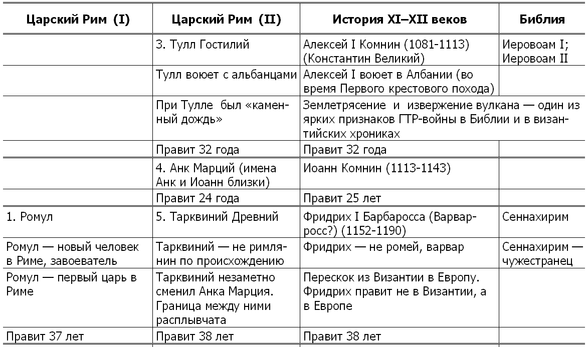 Часть 3. Хронология и общая концепция истории Рима и ВизантииВведениеГрубая схема возможной реконструкции правильной истории Рима и Византии была предложена в книге «Статистической хронологии–1» (см. [1]). В настоящей главе предлагается существенно более подробная версия глобальной хронологии Рима и Византии, согласованная как с исторической традицией XIV–XVI веков, так и с современным математическим исследованием совокупности дошедших до нас исторических памятников письменности (летописей, документов). Поскольку история Рима тесно связана с общей историей Средиземноморья, Европы и Азии, фактически мы будем говорить также об истории и этих регионов. При этом, мы будем опираться на некоторые факты из [1], и мы отсылаем читателя за подробностями к этой книге. Строение хронологии современного «учебника по истории»Напомним, что основной результат о структуре хронологии современного «учебника по истории» был получен в 1978–80 гг. А. Т. Фоменко (см. [1]). Вкратце, он состоит в следующем. 1) Общепринятая сегодня версия глобальной хронологии древности и средневековья, по-видимому, неверна. Эта ошибочная версия была впервые предложена в работах позднесредневековых хронологов И. Скалигера (XVI век) и Д. Петавиуса (XVII век) и затем практически не подвергалась сомнению со стороны большинства профессиональных историков. В то же время некоторые ученые высказывали обоснованные сомнения в правильности версии Скалигера—Петавиуса. 2) Эта хронологическая версия содержит дубликаты — повторения одних и тех же событий. Это означает, что одни и те же реальные события превращаются в ней в события якобы совершенно разные, разнесенные во времени на сотни и даже тысячи (!) лет. 3) Все события, датируемые в этой версии временем до 1000 г. н. э. (приблизительно) являются фантомными, т. е. на самом деле отражением более поздних событий. Таким образом, сохранившаяся до нашего времени реальная письменная история начинается приблизительно лишь с 1000 г. Это, конечно, не значит, что ранее этого времени «истории не было». Просто сведения о более ранних событиях до нас не дошли. Вместо них в хронологической версии Скалигера—Петавиуса помещены «фантомные» отражения более поздних событий. 4) События, датируемые в версии Скалигера—Петавиуса приблизительно от 1000 до 1300 гг. н. э. можно, грубо говоря, разделить на две части, два слоя. Одна часть датирована Скалигером и Петавиусом правильно. Она составляет «реальный слой» истории этого периода. Другая часть датирована ими неправильно и в действительности является отражением более поздних событий из XIII–XVII веков. Это — «фантомный слой» эпохи X–XIII веков, т. е. он состоит из событий, расположенных не на своем месте по оси времени. Правильное место этих событий — эпоха XIV–XVI веков. Другими словами, на отрезке 1000–1300 гг. н. э. в современной хронологической версии реальные (правильно датированные) события причудливо переплетаются с событиями «фантомными» (неправильно датированными и на самом деле — более поздними). 5) Что касается изложения событий после 1300 г. н. э., то здесь хронологическая версия Скалигера—Петавиуса в основном точна. Другими словами, мы можем доверять хронологии «современного учебника по истории» лишь когда речь идет о событиях после 1300 г. н. э. Мы не будем здесь останавливаться на критике скалигеровской хронологическо