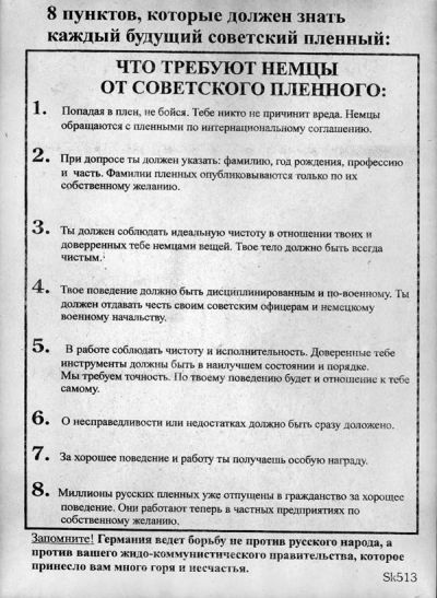 ИЛЛЮСТРАЦИИ![]() 1939 г. 2-й съезд колхозников-ударников. Сталин и крестьянка Попурашвили ![]() Еще до войны. Ворошилов и Каганович на аэродроме ![]() 1938 г. Парашютисты Пращикин и Кареева. Обратите внимание на их унылые лица. Классические «рабы советской системы», угнетенные бушующим террором НКВД… ![]() Польша, Вышнув. Немецкие военные полицейские расстреливают польских партизан. Автор снимка кончил плохо – неосмотрительно с его стороны было попадать в плен с подобными фотокарточками в бумажнике… ![]() Генерал Павлов, виновник страшных поражений Красной Армии в начале войны. Кто-нибудь верит, что этот субъект с чугунной рожей Терминатора трепетно «боялся» Сталина, как гимназистка – пьяного дворника? ![]() Вот оно, неоспоримое доказательство готовившихся в 1937 г. выборов в советский парламент на альтернативной основе – с несколькими кандидатами. Разумеется, данный бюллетень всего лишь образец. Только потому в нем и название округа, и фамилии кандидатов, и еще не установленная дата самих выборов условны. Безусловно главное указание: «Оставьте в избирательном бюллетене фамилию ОДНОГО кандидата, 0за которого Вы голосуете, остальные вычеркните». К сожалению, таких выборов пришлось ждать полвека… ![]() Март 1941 г. Командир аэростата «СССР ВР-73» Б. Невернов вместе с С. Гайгеровым совершил полет Москва – Новосибирская область ![]() Герр Гитлер с ребенком (ребенок, конечно, истинный ариец – другого с фюрером фотографироваться вряд ли поставили бы) ![]() Германия, аппаратчики НСДАП. Судя по знакам различия, функционеры уровня гау (примерно соответствует работникам обкома КПСС). Интересно, есть ли среди них затаившиеся «левые нацисты»? Не исключено… ![]() Немецкая открытка ![]() Маньчжурия, Мукден. Японская дружина гражданской обороны. Оборонялась хреново – в плен попали всем составом ![]() Андриан Макарович Стерлев (справа), колхозник, почетный гвардии красноармеец, награжден орденом Боевого Красного Знамени. Полтора года во время оккупации хранил знамя 43-го гвардейского полка ![]() 1943 г. Мелитопольское направление. Минометная батарея поддерживает огнем наступающую пехоту ![]() Писатель Фалькович. Попал в плен к немцам, организовал побег, в ходе которого бойцы не только вырвались на волю, но захватили и привели к своим 36 немцев. Фалькович отчего-то, вопреки штампам, не только не пострадал от злодеев-особистов, но был награжден орденом Ленина – а в сорок втором наградами не разбрасывались ![]() Василий Исаакович Талаш, легендарный «дед Талаш» (Белоруссия). Партизанил в Гражданскую. В Отечественную, будучи 91 года от роду, вновь ушел в партизанский отряд ![]() Плакат, приглашающий всех «щирых украинцев» вступать в дивизию СС «Галичина» ![]() ![]() ![]() Немецкие листовки, они же пропуска в плен ![]() Советские летчики. 3-й Белорусский фронт ![]() Немецкий офицер со своей фрау: вскарабкался, паршивец, на постамент сброшенного памятника в каком-то русском городе и строит из себя. Рано радовался. Все подобные фотографии в этой книге – трофейные, а это кое о чем говорит ![]() Но победили все-таки мы. Советские матросы поднимают знамя над гаванью Порт-Артура ![]() Власовцы «культурно отдыхают». А морды, обратите внимание, все же не лучатся бездумным весельем, напряжены. Должно быть, на дворе – конец войны, и пора задуматься… ![]() 1945, Потсдамская конференция. Сталин на заседании во дворце Цецил