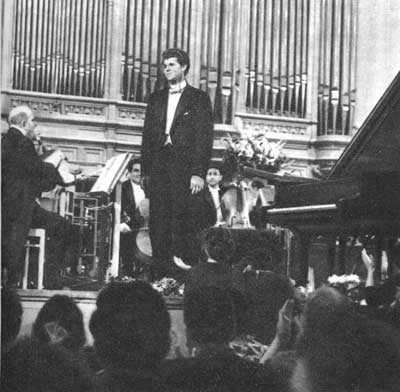 НАРОДЫ РАЗГОВАРИВАЮТ ДРУГ С ДРУГОМ * * * В 1958 г. в Москве состоялся большой музыкальный праздник—1-й Международный конкурс пианистов и скрипачей, носивший имя великого русского композитора Петра Ильича Чайковского. Москвичи были совершенно захвачены этим конкурсом. Билеты невозможно было достать; казалось, вся Москва собралась на этом маленьком пятачке, у входа в Большой зал консерватории. Начиная со II тура все очень напряженно ждали, кто же победит. Конкурс пианистов подарил москвичам много прекрасных знакомств. Надо сказать, что когда остаются только сильнейшие, то необычайно трудно отдать предпочтение кому-то одному. Не только в публике, но и в жюри часто возникают по этому поводу серьезные разногласия. Но тут произошло чудо: как только 23-летний американский пианист из Техаса, впервые принимавший участие в международном конкурсе, Ван Клиберн, исполнил на заключительном туре 3-й концерт Рахманинова, всем сомнениям пришел конец. Никто из присутствующих в зале не мог бы объяснить, в чем тут дело. На конкурсе было много первоклассных пианистов, некоторые не уступали Клиберну в мастерстве, иные обладали более совершенной техникой исполнения, но все это оказалось не главным. Вот что можно было сказать точно: ни один из участников конкурса не заставил себя так слушать. Когда играл Клиберн, каждому казалось, что он играет только для него. Клиберн обладал непревзойденным даром общения со слушателями да и с людьми вообще.