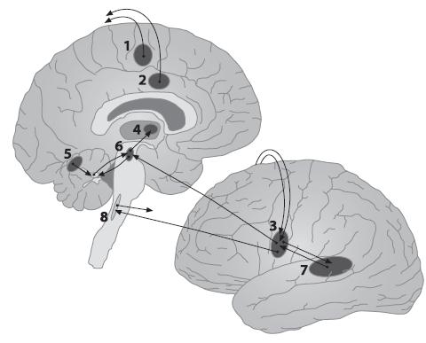 Рис. 2.8. Области мозга, которые активируются при произнесении отдельных гласных, слогов и простых бессмысленных “слов” (результаты получены при помощи томографии с использованием функционального ядерно-магнитного резонанса): (1) дополнительная моторная область, (2) поясная моторная область, (3) первичная моторная кора, (4) таламус, (5) мозжечок, (6) красное ядро, (7) области около верхней височной извилины, (8) двигательное ядро подъязычного нерва (не видно); активируются также базальные ядра (на рисунке не показаны)60. Возможно, примерно таким же путем сформировалась в свое время зона Брока. Она примыкает к моторной и премоторной коре, т. е. тем отделам мозга, которые отвечают за планирование последовательностей действий. Как пишет американский психолог Патрисия Гринфилд, вокруг зоны Брока и над ней расположены участки коры, обеспечивающие разнообразные умения — привычные, доведенные до автоматизма, комплексные, иерархически организованные цепочки действий63. Соответственно, поражения зоны Брока вызывают проблемы с последовательностями — во-первых, артикуляционных действий, а во-вторых, синтаксиса (обработки последовательности знаков, составляющей предложение). Возможно, именно поэтому при разрушении зоны Брока речь у носителей аналитических языков страдает больше, чем у носителей языков синтетических64: аналитические формы (типа англ. Present Perfect have received“ получил”) образуются в речи путем применения языкового навыка, программы, строящей форму из отдельных составных элементов по определенной модели, тогда как синтетические формы хранятся в памяти и распознаются как единое целое — поэтому у носителей синтетического языка бoльшие трудности с речью создает поражение зоны Вернике. Показательно, что даже среди носителей английского языка больные с поражением зоны Брока испытывают больше проблем с формами прошедшего времени от правильных глаголов типа received “получил” от receive “получать” (порождаемыми языковым навыком), а больные с поражением зоны Вернике — с аналогичными формами неправильных глаголов типа went “шел” от go “идти” (которые хранятся в памяти в готовом виде). Таким образом, можно говорить лишь о том, что некоторые зоны мозга предпочтительны для определенных речевых функций, контролируют эти функции (выполняемые самыми разными структурами) в большей степени, чем другие. Наблюдаемая асимметрия полушарий обусловлена тем, что, как справедливо замечает Т. Дикон, если бы оба полушария мозга были равноправными и выполняли одни и те же функции, это привело бы к неразберихе: не существовало бы возможности выбрать, какое из полушарий должно произвести соответствующее действие в данный конкретный момент. И естественный отбор благоприятствует тем особям, в чьем мозге одни функции сосредоточены в одной части, а другие — в другой: такие особи выдают более быструю и точную реакцию на внешние события65. Кроме того, особи, у которых полушария функционально неодинаковы, могут использовать для различных функций бoльшую часть мозга (поскольку симметрично расположенные структуры не дублируют друг друга). Для полноценной работы языкового механизма необходимы оба полушария: левое занимается анализом фонем, слов, синтаксических структур предложений, правое же следит за общей последовательностью текста, а также за его просодическим о