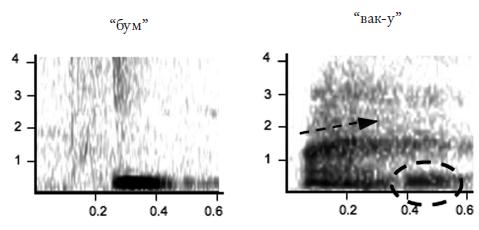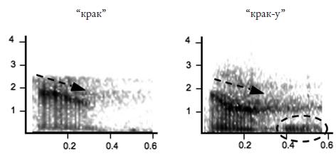 Рис. 4.9. Звуковые сигналы мартышек Кемпбелла (сонограммы). Черная стрелка показывает движение формант; пунктирной рамкой обведен “суффикс” “-у”67. В коммуникативной системе мартышек Кемпбелла представлены и правила “порядка слов”: например, сигнал “бум” употребляется только в начале цепочки криков и всегда повторяется дважды, сигнал “хок” предшествует сигналу “хок-у”, если они встречаются вместе, серия криков, предупреждающая об орле, начинается обычно с нескольких криков “хок”, а заканчивается несколькими криками “крак-у” и т. д. По мнению авторов исследования, в некоторых аспектах эта коммуникативная система приближается к человеческому языку даже больше, чем успехи человекообразных обезьян, обученных языкам-посредникам и умеющих составлять комбинации типа “ВОДА”+“ПТИЦА”, хотя настоящей грамматикой она все же не обладает68. И дело здесь не только в том, что правила достаточно просты, а их число невелико. Главное, на мой взгляд, отличие этой системы от человеческого языка — отсутствие в ней достраиваемости: есть шесть криков и девять возможных “предложений”, и этим все ограничивается, новые знаки и новые сообщения не строятся. Ограниченность исследованного материала не дает возможности судить о том, являются ли все эти сигналы (в том числе содержащие суффикс “-у”) и их комбинации врожденными, присущими всем представителям Cercopithecus campbelli campbelli, или же, по крайней мере, некоторая часть этой системы является культурной традицией данной конкретной популяции. По наблюдениям авторов, верно скорее первое: сигналы издаются без волевого контроля, самцы не демонстрируют намерения информировать сородичей, они просто испытывают эмоции — и на этом фоне у них издаются соответствующие крики. В то же время эти данные показывают, что даже при отсутствии волевого контроля за звукопроизводством жизнь вида, ведущего групповой образ жизни, в лесу, в условиях низкой видимости и большого количества хищников располагает к формированию коммуникативной системы, которая использует комбинации звуковых сигналов (как друг с другом, так и с элементами, не являющимися отдельными сигналами), чтобы из небольшого количества доступных врожденных криков произвести больше различных сообщений. Если рассмотреть коммуникативные системы различных видов позвоночных, можно увидеть еще одну общую тенденцию — уменьшение степени врожденности. У низших животных, обладающих коммуникативной системой, врожденной является как внешняя форма сигнала, так и его “смысл” (то, что так или иначе будет определять поведение животного, воспринявшего данный сигнал); реакция на сигнал так же врожденна и стереотипна, как и реакция на несигнальные раздражители (поэтому такие сигналы называются релизерными). Например, птенец серебристой чайки, выпрашивая пищу, клюет красное пятно на клюве родителя, и это побуждает родителя покормить птенца, — в этом примере врожденными, инстинктивными, являются как действия птенца, так и реакция взрослой птицы. Сигналы такого рода, разумеется, могут до некоторой степени совершенствоваться в ходе развития отдельной особи (так, птенец чайки с течением времени “натренировывается” более метко попадать в красное пятно), но не более, чем любые другие инстинктивные действия. У животных, обладающих более высоким уровнем когнитивно