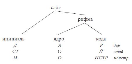 Рис. 6.4. Инициаль, рифма, ядро и кода — так часто называют части слога. Особенно это принято в традиции изучения китайского и подобных ему “односложных” языков.