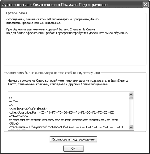 Теперь, получив команду о доставке почты, клиент соединится с WinAntiSPAM, который, в свою очередь, подключится к почтовому серверу и начнет закачку заголовков. Эксперт по борьбе со спамом SpamExperts HomeЯ стараюсь описывать бесплатные продукты, так как не каждый пользователь имеет возможность купить лицензию. К тому же часто такая покупка связана с трудностями, так как используемые на Западе системы денежных расчетов не всегда любят наших. Я долго думал, какую систему выбрать, чтобы она боролась со спамом, была локализована, понятна в настройках и использовании и при этом бесплатна. Обучаемая система для борьбы со спамом SpamExperts Desktop поддерживает работу с любыми почтовыми клиентами, может получать почту по протоколам POP3 и IMAP, в том числе и по защищенным соединениям. Она корректно работает с кириллицей, ее интерфейс приятен и прост. Программа платная, но после 30 дней тестового периода, если лицензия не куплена, она автоматически становится бесплатным вариантом SpamExperts Desktop Limited version. Версия Limited имеет ограничения по количеству заблокированных и разрешенных адресов, отсутствие сканирования почты на вирусы и технической поддержки, однако ее функциональности достаточно для большинства домашних пользователей. Домашняя страница, где можно получить последнюю информацию и скачать продукт, – http://www.spamexperts.com/ru/. После установки программы потребуется перезагрузка компьютера. Программа SpamExperts после установки не требует никаких настроек и будет автоматически перехватывать все попытки соединения с почтовыми серверами и заносить информацию в список, о чем пользователь будет предупрежден с помощью всплывающего сообщения. Вам не нужно будет делать это вручную: SpamExperts будет периодически проверять наличие новой почты и выводить сообщение при ее обнаружении. Об активности программы свидетельствует значок в области уведомлений. Он может быть двух видов: обычный (программа в режиме ожидания) и подсвеченный красным (идет проверка почты). Основное окно программы показано на рис. 8.11. ![]() Рис. 8.11. Основное окно программы SpamExperts Никакие настройки в почтовом клиенте делать не нужно, вы просто запускаете его и получаете почту. SpamExperts требуется некоторое время на обучение, но постепенно он будет все меньше ошибаться. Полученные сообщения автоматически распределяются по трем группам: • Не Спам – сюда помещаются письма, признанные не спамом; • Сомнительные – SpamExperts еще не собрал достаточную статистику, чтобы однозначно идентифицировать категорию; • Спам – сюда помещаются письма, оцененные как спам. Когда SpamExperts допускает ошибку или не уверен в классификации, вы должны самостоятельно изменить категорию, с помощью кнопки мыши или контекстного меню перетащив письмо на соответствующую кнопку. Когда вы переносите сообщение из папки Спам в Не Спам, оно будет доставлено в ваш почтовый клиент. Когда обучение прошло 10 нормальных сообщений и 10 сообщений спама, автоматизируется самообучающийся фильтр, и программа сможет самостоятельно классифицировать большинство писем. По щелчку на сообщении правой кнопкой мыши появляется контекстное меню, с помощью которого можно переместить сообщение в другую категорию, а почтовый адрес корреспондента занести в «белый» или «черный» список. «Белый» список адресатов формируется путем выбора пункта меню Добавить отправителя в с