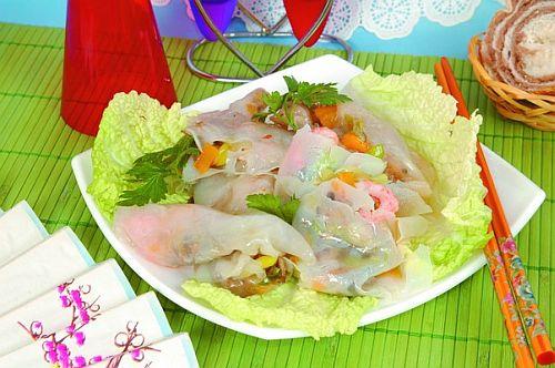 Лодочки из копченого лосося с овощами ![]() 173 ккал, 30 мин, 1 порции. Продукты: 1 крупный лимон 100 г филе копченого лосося 1 дайкон 1 морковь 1 столовая ложка оливкового масла листья зеленого салата соль Листья салата вымыть, обсушить, выложить на тарелку. Дайкон и морковь очистить, вымыть, часть корнеплодов нарезать фигурными ломтиками, остальные – соломкой. Лимон вымыть, разрезать вдоль пополам, вынуть мякоть и выжать сок. Филе лосося нарезать маленькими кубиками, смешать с нарезанными соломкой дайконом и морковью, добавить оливковое масло и 2 чайные ложки лимонного сока, посолить, перемешать. Приготовленной смесью нафаршировать половинки лимона, выложить закуску на листья салата и оформить фигурными ломтиками моркови и дайкона. Кулечки из рисовой бумаги с лососем 215 ккал, 25 мин, 2 порции. Продукты: 4 листа рисовой бумаги 200 г отварного филе лосося 1 стручок болгарского перца 1 зубчик чеснока 1 столовая ложка семян кунжута 2 столовые ложки растительного масла соевый соус зелень сельдерея перец соль Зелень сельдерея вымыть. Чеснок очистить, вымыть, измельчить с помощью ножа. Болгарский перец вымыть, удалить плодоножки и семена, мелко нарезать. Филе лосося нарезать маленькими кубиками, смешать с болгарским перцем, чесноком и семенами кунжута, поперчить, посолить. Рисовую бумагу замочить на 15 с в холодной воде, выложить на разделочную доску. На середину каждого листа положить приготовленную начинку, свернуть в виде кулечков и обжарить их со всех сторон в разогретом растительном масле. Закуску выложить на тарелку, украсить листиками сельдерея, подать с соевым соусом. Конвертики из рисовой бумаги с лапшой 148 ккал, 25 мин, 2 порции. Продукты: 4 листа рисовой бумаги 50 г рисовой лапши 1 морковь 1 луковица 2 столовые ложки растительного масла 0,5 пучка зеленого лука соевый соус перец соль Лапшу залить холодной кипяченой водой, через 15 мин, откинуть на сито. Морковь очистить, вымыть, натереть на крупной терке. Репчатый лук очистить, вымыть, мелко нарезать. Зеленый лук вымыть, нарезать. Морковь и репчатый лук жарить на масле 5 мин, добавить лапшу и зеленый лук, посолить, поперчить, пере-мешать. Рисовую бумагу замочить на 1 мин, в холодной кипяченой воде, выложить на разделочную доску. В центр каждого листа положить приготовленную начинку, свернуть в виде конвертиков. Подать к столу с сое-вым соусом. Трубочки из рисовой бумаги с зеленью 107 ккал, 20 мин, 2 порции. Продукты: 4 листа рисовой бумаги 0,5 пучка зеленого лука 0,5 пучка шпината 0,5 пучка зелени петрушки 1 столовая ложка сливочного масла 2 столовые ложки растительного масла соевый соус маринованный имбирь соль Зеленый лук и петрушку вымыть, мелко нарезать. Шпинат вымыть, нарезать, припустить в сливочном масле. Добавить лук и петрушку, посолить, перемешать. Рисовую бумагу замочить в холодной воде на 15 с, выложить на разделочную доску. Распределить ровным слоем приготовленную начинку, свернуть в виде рулетов и обжарить на сковороде в раскаленном растительном масле. Подать к столу с соевым соусом и тонко нарезанным маринованным имбирем. Конвертики из рисовой бумаги с креветками и овощами ![]() 217 ккал, 25 мин, 2 порции. Продукты: 4 листа рисовой бумаги 150 г отварных очищенных креветок 2 стручка болгарского перца 1 луковица 1 морковь листья пекинской капусты зелень петрушки 2 столовые ложки растительного масла 1 чайная л