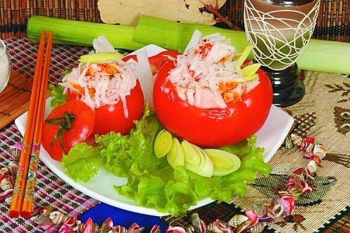 Закуска из помидоров и морепродуктов ![]() 211 ккал, 30 мин, 1 порции. Продукты: 2 помидора 1 яблоко 200 г замороженного морского коктейля 2 помидора черри 2 ломтика лимона 1 стебель сельдерея листья зеленого салата 1 столовая ложка лимонного сока 1 столовая ложка майонеза 1 чайная ложка соевого соуса соль Помидоры вымыть, срезать верхушки и аккуратно вынуть мякоть. Помидоры черри и листья салата вымыть. Яблоко вымыть, разрезать пополам, удалить сердцевину. Половинку яблока нарезать фигурными ломтиками, вторую очистить, нарезать соломкой и сбрызнуть лимонным соком. Стебель сельдерея вымыть, нарезать. Морской коктейль отварить в подсоленной воде, охладить, смешать с яблоком и сельдерем, добавить соевый соус. Приготовленной начинкой наполнить помидоры, украсить майонезом. Выложить фаршированные помидоры на тарелку, выстланную листьями салата, украсить закуску помидорами черри, ломтиками яблока и лимона. Закуска из помидоров и имбиря 102 ккал, 20 мин, 2 порции. Продукты: 4 помидора 1 дайкон 1 пучок зеленого салата 50 г маринованного имбиря 2 столовые ложки десертного вина 1 столовая ложка лимонного сока 1 чайная ложка коричневого сахара соль Листья салата вымыть, обсушить. Помидоры вымыть, нарезать дольками. Дайкон очистить, вымыть, нарезать кружочками. Маринованный имбирь тонко нарезать. Для приготовления соуса смешать десертное вино, лимонный сок, сахар и соль. Подготовленные помидоры, дайкон и имбирь выложить на плоское блюдо, выстланное листьями салата. Полить закуску приготовленным соусом.