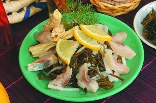 Салат из морской капусты с яблоками 142 ккал, 20 мин, 2 порции. Продукты: 300 г консервированной морской капусты 2 яблока 1 морковь 1 маринованный огурец 2 столовые ложки лимонного сока 2 чайные ложки соевого соуса 2–3 веточки сельдерея перец Морковь очистить, вымыть, нарезать соломкой. Яблоки вымыть, очистить от кожицы, удалить сердцевину, нарезать соломкой. Маринованный огурец нарезать соломкой. Зелень сельдерея вымыть. Смешать морскую капусту с яблоками, морковью и огурцом, поперчить, заправить соусом, приготовленным из лимонного сока и соевого соуса. Поставить салат на 1 ч в холодильник, затем перемешать, разложить по тарелкам и украсить листиками сельдерея. Салат из палтуса и морской капусты 247 ккал, 40 мин, 4 порции. Продукты: 400 г филе палтуса 100 г консервированной морской капусты 2 яйца 1 луковица 0,5 пучка зелени укропа и петрушки 1 столовая ложка растительного масла 1 столовая ложка соевого соуса 1 чайная ложка рисового уксуса перец соль Филе палтуса промыть, отварить в подсоленной воде, охладить, нарезать небольшими кусочками. Яйца сварить вкрутую, охладить, очистить, нарубить. Лук очистить, вымыть, нарезать полукольцами. Зелень укропа и петрушки вымыть, мелко нарезать. Для приготовления соуса смешать растительное масло, сое-вый соус, рисовый уксус и перец. Смешать палтус с морской капустой, яйцами, луком и зеленью, разложить салат по тарелкам, полить приготовленным соусом. Салат из жареной камбалы с морскими водорослями 319 ккал, 40 мин, 2 порции. Продукты: 400 г филе камбалы 50 г сушеных водорослей вакамэ 2 столовые ложки растительного масла 2 столовые ложки кукурузной муки 2 чайные ложки рисового уксуса 1 стебель лука-порея 0,5 пучка зелени петрушки перец соль Филе камбалы промыть, нарезать небольшими кусочками, посолить, поперчить, сбрызнуть уксусом. Обвалять кусочки рыбы в кукурузной муке и обжарить в растительном масле. Вакамэ промыть, замочить на 5 мин, в теплой кипяченой воде, затем бланшировать в кипятке в течение 30 с, обдать холодной водой и нарезать небольшими кусочками. Лук-порей вымыть, нарезать кольцами. Зелень петрушки вымыть, мелко нарезать. Смешать камбалу, вакамэ, лук-порей и петрушку, разложить салат по тарелкам и подать к столу. Салат из кальмаров и маринованного морского окуня 252 ккал, 45 мин, 2 порции. Продукты: 200 г отварных кальмаров 200 г отварного филе морского окуня 1 пучок зеленого салата 0,5 пучка зеленого лука 2 столовые ложки рисового уксуса 1 столовая ложка соевого соуса 1 чайная ложка тертого маринованного имбиря перец Филе морского окуня нарезать небольшими продолговатыми кусочками и залить маринадом, приготовленным из рисового уксуса, соевого соуса, тертого имбиря и перца. Поставить рыбу на 30 мин, в холодильник. Кальмары нарезать соломкой. Листья салата и зеленый лук вымыть, нарезать. Смешать маринованную рыбу с кальмарами, салатом и луком, полить маринадом из-под рыбы. Салат из морского окуня с креветками и омлетом 271 ккал, 35 мин, 4 порции. Продукты: 200 г отварного филе морского окуня 150 г отварных креветок 150 г отварных шампиньонов 0,5 пучка зелени петрушки 2 яйца 2 столовые ложки сливок 1 столовая ложка растительного масла 1 столовая ложка лимонного сока молотая паприка перец соль Яйца взбить со сливками и небольшими количеством соли, приготовить на растительном масле омлет, слегка охладить его и нарезать полосками ширин