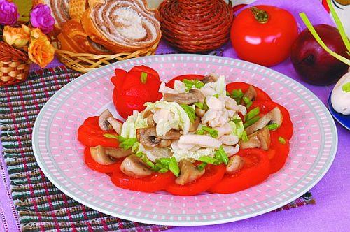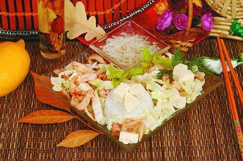 Салат из семги с шампиньонами и пекинской капустой ![]() 339 ккал, 40 мин, 2 порции. Продукты: 200 г филе семги 500 г пекинской капусты 300 г шампиньонов 50 г редиса 2 столовые ложки сливочного масла 1 стебель лука-порея 1 ломтик лимона соль Филе семги промыть, отварить в подсоленной воде, охладить, мелко нарезать. Шампиньоны вымыть, крупно нарезать. Капусту вымыть, нашинковать. Редис вымыть, из одного корнеплода вырезать цветок лилии, остальные нарезать соломкой. Лук-порей вымыть, отрезать от стебля кусочек длиной 5 см, вырезать из него цветок хризантемы и положить в холодную воду. Остальной лук мелко нарезать, тушить вместе с шампиньонами в сливочном масле в течение 5 мин, добавить капусту, посолить, тушить до готовности. Смешать приготовленную смесь с семгой, выложить на блюдо. Украсить салат цветами из лука и редиса, ломтиком лимона и соломкой из редиса. Салат из кальмаров с капустой и тофу ![]() 221 ккал, 20 мин, 2 порции. Продукты: 200 г отварных кальмаров 200 г пекинской капусты 100 г тофу 100 г отварного риса 50 г дайкона 2 столовые ложки рисового уксуса зелень укропа и сельдерея молотая паприка соль Кальмары нарезать полосками. Тофу нарезать кубиками. Капусту вымыть, мелко нарезать, смешать с кальмарами и тофу, посолить. Зелень укропа и сельдерея вымыть. Для приготовления соуса дайкон очис-тить, вымыть, натереть на терке, посолить и залить уксусом. Из риса сформовать 2 колобка, выложить их на тарелки, рядом положить приготовленную ранее смесь. Посыпать салат паприкой, украсить листиками укропа и сельдерея, подать с соусом из дайкона.