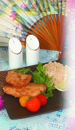 Рулет из окуня с грибами 267 ккал, 45 мин, 2 порции. Продукты: 500 г филе морского окуня 200 г шиитаке 1 яйцо 1 помидор 0,5 пучка зелени петрушки 2 столовые ложки растительного масла 3 столовые ложки кукурузного крахмала 2 чайные ложки имбирного сока соль Шиитаке промыть, мелко нарезать, обжарить в масле (1 столовая ложка), посолить. Филе окуня промыть, нарезать кусками, пропустить через мясорубку, добавить яйцо, соль, имбирный сок и крахмал, перемешать. Разделить приготовленный фарш на 2 части, выложить на разделочную доску слоем 1 см, сверху распределить жареные шиитаке и свернуть в виде рулетов. Завернуть рулеты в смазанную оставшимся растительным маслом фольгу, готовить в пароварке в течение 25–30 мин. Помидор вымыть, нарезать кружочками. Зелень петрушки вымыть. Готовые рулеты нарезать поперек толстыми кружочками, разложить по тарелкам, украсить кружочками помидора и веточками петрушки. Рыбные котлеты с креветками и дайконом 258 ккал, 40 мин, 2 порции. Продукты: 500 мл рыбного бульона 300 г филе морской рыбы 100 г очищенных креветок 1 яйцо 1 небольшой дайкон 2 столовые ложки муки 1,5 столовой ложки соевого масла 1 столовая ложка крахмала 1 столовая ложка соевого соуса 1 столовая ложка десертного вина 1 столовая ложка горчицы 2–3 веточки петрушки соль Дайкон очистить, вымыть, нарезать кружочками. Зелень петрушки вымыть. Рыбное филе промыть, нарезать крупными кусками, пропустить через мясорубку, добавить яйцо и крахмал, посолить, перемешать. Смочить руки холодной водой, сформовать небольшие котлеты, положив в середину каждой креветки. Запанировать котлеты в муке, обжарить на сковороде в разогретом масле. Переложить в сотейник, залить горячим бульоном, добавить соевый соус и вино, тушить под крышкой на маленьком огне 5 мин. Добавить дайкон, тушить еще 5–7 мин. Готовые котлеты разложить по тарелкам, полить соусом, образовавшимся при тушении, украсить горчицей и листиками петрушки. Котлеты из горбуши, запеченные с желтком 401 ккал, 45 мин, 2 порции. Продукты: 400 г филе горбуши 2 столовые ложки растительного масла 2 столовые ложки муки 1 столовая ложка крахмала 1 столовая ложка десертного вина 1 столовая ложка даси 1 желток 1 чайная ложка мисо 0,5 лимона 0,5 пучка зелени петрушки и укропа соль Филе горбуши промыть, пропустить через мясорубку, добавить крахмал и соль, перемешать. Из полученного фарша сформовать 4 котлеты, обвалять их в муке, обжарить с обеих сторон в растительном масле, переложить в форму для запекания. Смешать яичный желток с даси, вином и мисо, полить приготовленной смесью котлеты. Запекать в предварительно разогретой духовке до образования золотистой корочки. Зелень укропа и петрушки вымыть, мелко нарезать. Лимон вымыть, нарезать кружочками. Готовые котлеты разложить по тарелкам, посыпать зеленью и украсить кружочками лимона. Морской судак, запеченный с луком и лимоном ![]() 335 ккал, 45 мин, 4 порции. Продукты: 500 г морского судака 300 г отварного риса 2 луковицы 1 лимон 2 столовые ложки сливочного масла 2–3 веточки кинзы молотая паприка соль Подготовленного судака нарезать порционными кусками, посолить, посыпать паприкой. Лук очистить, вымыть, нарезать кольцами, спассеровать в сливочном масле. Лимон вымыть, нарезать кружочками. Зелень кинзы вымыть. На лист фольги выложить лук, на него – куски судака и лимон. Плотно завернуть, поставить в предварительно разогр