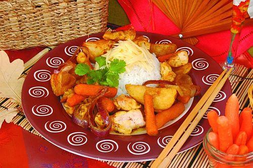 Куриные фрикадельки с грибами и репой 168 ккал, 45 мин, 4 порции. Продукты: 400 г мяса курицы 400 мл даси 4 репы 1 пучок шпината 1–2 сушеных древесных гриба 1 яйцо 1 столовая ложка вина мирин 1 столовая ложка соевого соуса 1 столовая ложка кукурузного крахмала 1 столовая ложка сахара 1 чайная ложка тертого свежего или маринованного имбиря соль Мясо курицы промыть, пропустить через мясорубку. Грибы промыть, замочить на 20 мин, в холодной воде, затем мелко нарезать и смешать с куриным фаршем. Добавить яйцо, крахмал и имбирь, перемешать и сформовать небольшие фрикадельки. Репу очистить, вымыть, нарезать брусочками. Шпинат вымыть. Смешать даси с соевым соусом, вином и сахаром, довести до кипения, положить фрикадельки и варить на маленьком огне под крышкой 5–7 мин. Добавить репу и тушить под крышкой до готовности. За 1–2 мин, до готовности добавить шпинат и соль. Жареное куриное филе с рисом 312 ккал, 40 мин, 4 порции. Продукты: 500 г куриного филе 150 г риса 2 моркови 2 столовые ложки растительного масла 3 столовые ложки соевого соуса 2 столовые ложки сахара 2 чайные ложки саке 0,5 пучка зелени петрушки 0,5 лимона молотый красный перец молотая паприка соль Куриное филе промыть, нарезать маленькими кубиками. Морковь очистить, вымыть, нарезать кубиками. Куриное филе и морковь жарить на сковороде в растительном масле 5 мин, добавить соевый соус, саке и сахар, перемешать, готовить на сильном огне до тех пор, пока жидкость не выкипит. Зелень петрушки вымыть. Лимон вымыть, нарезать кружочками. Рис промыть, отварить в подсоленной воде, откинуть на сито. Готовую курицу разложить по тарелкам, гарнировать рисом, посыпать перцем и паприкой. Украсить блюдо веточками петрушки и кружочками лимона, подать к столу. Тушеная курица с овощами и карри 331 ккал, 40 мин, 4 порции. Продукты: 600 г куриных окорочков 200 г риса 100 г маринованных корнишонов 100 г мелких маринованных помидоров 2 луковицы 2 клубня картофеля 1 морковь 1 зубчик чеснока 2 столовые ложки растительного масла 2 столовые ложки карри 0,5 пучка зелени петрушки соль Куриные окорочка промыть, срезать мясо, нарезать его небольшими кусочками. Морковь и картофель очистить, вымыть, нарезать кубиками. Лук очистить, вымыть, нарезать кольцами. Чеснок очистить, вымыть, мелко нарезать. Зелень петрушки вымыть, мелко нарезать. В глубокой сковороде разогреть растительное масло, положить чеснок, жарить 1 мин, затем добавить мясо и жарить по образования золотистой корочки. Добавить морковь, картофель, лук и карри, посолить, жарить 2–3 мин. Залить горячей кипяченой водой так, чтобы она слегка покрывала продукты, тушить на маленьком огне под крышкой до готовности. Рис отварить в подсоленной воде, откинуть на сито. Разложить рис по тарелкам, сверху положить тушеную курицу с овощами, посыпать зеленью петрушки. Украсить маринованными корнишонами и помидорами. Курица, жаренная с картофелем и шампиньонами ![]() 183 ккал, 45 мин, 4 порции. Продукты: 300 г белого мяса курицы 4 клубня картофеля 300 г шампиньонов 100 г помидоров черри 1 стручок болгарского перца 1 красная луковица 0,5 пучка зелени петрушки 2 столовые ложки растительного масла 2 столовые ложки соевого соуса 2 столовые ложки лимонного сока 1 столовая ложка десертного вина 1 столовая ложка крахмала Мясо курицы промыть, нарезать кусочками средней величины, сбрызнуть смесью лимонного сока и вина, оставить на 15–20 