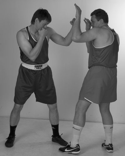 Уклоны от прямых ударов Стоя в стойке, сгибаем ноги в коленях и опускаемся вниз, одновременно с этим поворачиваем пятку передней ноги. Вся передняя часть тела поворачивается вперед. Мы также вкручиваемся в пол, но уже стоя в боковой стойке. Вес тела слегка распределен на задней ноге. Передняя рука и переднее плечо впереди, кулаки около лба. Фото 59. Этим же путем возвращаемся в исходную стойку. Фото 59Стоя в стойке, сгибаем ноги в коленях и опускаемся вниз, одновременно с этим поворачивая пятку задней ноги. Вся задняя половина тела поворачивается вперед. Вес тела слегка распределен между ногами. Фото 60. Фото 60Стоим в стойке. Помним о квадрате, в котором располагаются ноги. Опускаясь вниз, сгибаем заднее колено, одновременно делая небольшой шаг передней ногой в верхний угол воображаемого квадрата, ступня на носке. Поворачиваем переднюю часть тела вперед не за счет поворота пятки, а за счет небольшого шага. Вкручиваясь, мы переднюю руку можем поднести к виску, а можем выставить вперед, кулаком к подбородку противника. Задняя рука на месте. Фото 61, 62. Несмотря на то что передней ногой мы немного шагнули вперед, вес тела продолжает находиться на задней ноге, мы опустились вниз за счет ее сгибания. Мы как бы подсели под противника. Фото 63. Положение кулака передней руки зависит от того, на какую дистанцию мы хотим войти по отношению к противнику. Чем ближе мы к противнику, тем ближе к нашей голове кулак передней руки. Фото 61 Фото 62 Фото 63Возвращаемся в обычную стойку и возврашаем переднюю ногу на прежнее место. Опускаясь вниз, переносим вес тела с задней ноги на переднюю, одновременно поворачивая заднюю пятку, а вместе с ней всю заднюю половину тела вперед. Передней ногой делаете шаг в левый верхний угол, это будет ваша опора, которая не даст вам потерять равновесие. Обе руки кулаками около лба. Фото 64, 65. Фото 64 Фото 65Умение выполнять уклоны стоя на месте и за счет шагов даст нам большие возможности в будущем. При правильном выполнении уклона всё равно под какую руку его делать. Ведь главное – сместить голову с линии атаки. Очень важный момент обучения. В работе с партнером нет главного бойца и второстепенного. Оба задания являются основными. Ведь в бою важен любой элемент, поэтому оба партнера должны стремиться максимально правильно выполнять свою часть задания. При этом, на первых порах, нельзя допускать в работе дух соперничества. Задание должно выполняться максимально правильно, начиная с медленного темпа с постепенным увеличением скорости. Работая в паре, на этом этапе нужно помогать напарнику почувствовать движение до того момента, пока не будут оптимизированы все элементы. В данном случае это устойчивая позиция, минимальная амплитуда смещения в сторону, опущенная на грудь голова, правильное положение рук и высота кулаков и конечно же обязательное возвращение в стойку по той же траектории. Итог данного этапа: все удары – движение вверх, все защиты – движение вниз. Принцип пружины. |