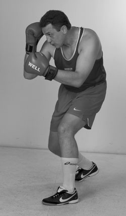 Выходы из атак Для полноты понимания законченности действия, введем еще одну формулу: ВХОД, АТАКА, ВЫХОД. Формула очень проста. Подойти, ударить и уйти, не получив в ответ. Последний параметр является очень важным, но его бойцы часто игнорируют. Просишь ученика ударить по лапам какой-то удар. Почти все бьют и остаются стоять на месте. Ни уклона, ни шага назад, ни подставки. Может, чрезмерная уверенность, а может, недооценка того, что будет в бою, и это не правильно. Выход из атаки – наиважнейший элемент боя, и его наработка должна быть обязательной и постоянной. Только выше приведенная формула характеризует полностью выполненное действие. Маленький секрет: чем точнее и сильнее атака, тем легче после нее производить защитное действие. Противник на мгновение зажимается. И каждое защитное движение всегда может быть подготовкой новой атаки. Это дает нам возможность увеличивать длительность атак и количество ударов в них. Стоя в стойке, наносим прямой удар в голову и остаемся в положении с вытянутой рукой. Фото 121. Затем, возвращая ударную руку назад, делаем уклон в ту сторону, куда возвращается ударная рука. Фото 122. После удара левой рукой уклоняемся в левою сторону, после удара правой – в правую. Фото 123, 124. Уклон можно делать стоя на месте, но перспективнее выполнить его с шагом в ту же сторону. Ударьте, а возвращаясь, уклонитесь и замрите в этом положении. Видите, на уклоне мы, вкручиваясь вниз, разворачиваем половину тела и можем нанести новый удар. Очень важно понимать это и после уклона принимать позицию для следующей атаки. Если мы хотим нанести удар в корпус передней рукой, то, делая уклон в сторону передней руки, опускаем ее на нужную высоту, под грудную мышцу. Задняя сторона тела на небольшом шаге передней ноги поворачивается вперед. Фото 125, 126. Фото 121 Фото 122 Фото 123 Фото 124 Фото 125 Фото 126Если же мы хотим нанести удар в голову, то на таком же уклоне оставляем руку на той же высоте и подносим ее к своей голове. Локти внизу, кулаки около лба, а лучше, если передняя рука чуть впереди. Фото 127, 128. Мы на уклоне занимаем позицию, при которой у кулаков самая близкая дистанция до цели. И вот здесь рождается первое знание о скорости. В данном случае – о минимальном смещении головы и самом близком пути кулаков до цели. Это для того чтобы они прошли его за минимальное время. Сила разжимателей мышц здесь на втором месте. Фото 127 Фото 128Теперь попробуем пробить несколько ударов передней рукой, чередуя удар в корпус с ударом в голову. Удар в голову, уклон с замахом на удар в корпус. Удар в корпус, уклон с замахом на удар в голову. Фото 129, 130, 131, 132, 133. В голову, уклон, в корпус, уклон, в голову, уклон, в корпус... Высота кулака передней руки на каждом уклоне меняется. В корпус бьем снизу, а в голову – любой удар. Теперь будем бить в движении вперед. Уклон на шаг передней ногой, удар на шаг задней. Стараемся оставаться в боковом положении, а для этого задняя нога на шаге не должна перегонять переднюю. Если хотим закончить серию, то после очередного выхода становимся в стойку и заканчиваем атаку. Фото 129 Фото 130 Фото 131 Фото 132 Фото 133Теперь повторные удары задней рукой. После удара задней рукой в голову, делаем уклон на возвращении задней руки и немного подсаживаемся вниз. Если хотим остаться под противником, то, уклоняясь, делаем небольшой шаг передней ногой вперед, как бы по