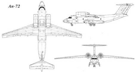 АН-72 ТАКТИЧЕСКИЙ ВОЕННО-ТРАНСПОРТНЫЙ САМОЛЕТ АН-72 РАЗМЕРЫ. Размах крыла - 31.89 м; длина - 28,07 м; высота - 8,65 м; площадь крыла - 98,53 м3 . МАССЫ И НАГРУЗКИ, кг. Пустого самолета - 19050, максимальная взлетная - 34500, топлива - 12950, максимальная коммерческая нагрузка - 10000, СИЛОВАЯ УСТАНОВКА. Два ТРДД Д-36 (2x6500 кгс) или Д-435 (2x7500 кгс), оснащенных системой реверса тяги. Имеется ВСУ. Запас топлива на самолете Ан-74 составляет 12950 кг, а на Ан-74 увеличен до 13200 кг. ЛЕТНЫЕ ХАРАКТЕРИСТИКИ. Максимальная скорость - 705 км/ч; крейсерская скорость - 550-600 км/ч; практический потолок - 10700 м; практическая дальность: с максимальной нагрузкой - 800 км,с нагрузкой 7500 кг - 2000 км; перегоночная дальность - 4800 км; длина разбега - 930 м; длина пробега - 465 м. ДОПОЛНИТЕЛЬНЫЕ СВЕДЕНИЯ Исследования облика перспективного транспортного самолета с кротким взлетом и посадкой были начаты в Киеве по инициативе О.К.Антонова в 1972 г. Предложение ОКБ нашло поддержку ВВС, заинтересованных во фронтовом военно-транспортном самолете с грузоподъемностью порядка 5 т. предназначенном для замены самолетов Ан-24 и Ан-26. 31 августа 1977 г. новая машина выполнила свой первый испытательный полет. В 1978 г. на Киевском авиационном заводе началась подготовка к серийному производству Ан-72. Однако многочисленные экспортные заказы на самолет Ан-32. имевшиеся у завода, затрудняли освоение выпуска новой техники. В этих условиях было принято решение перевести серийный выпуск Ан-72 в Харьков, где в то время завершалось производство лайнеров Ту-134. Вынужденная пауза, вызванная пересмотром планов серийного производства, была использована ОКБ для внесения существенных изменений в конструкцию самолета. Они были обусловлены появившейся заинтересованностью в Ан-72 министерства гражданской авиации, которое нуждалось в новой транспортной машине, способной заменить Ил-14. Ан- 26 и Ан-12 в северных регионах Сибири и Дальнего Востока. Однако гражданскому заказчику требовался самолет с несколько большей дальностью (до 3200 км) и грузоподъемностью (до 10 т). чем исходный Ан-72. В результате появился новый вариант с крылом увеличенного размаха и удлиненным фюзеляжем. Изменения, внесенные в конструкцию, несколько ухудшили взлетно-посадочные и скоростные характеристики машины, однако был достигнут компромисс между требованиями ВВС и МГА. Первый серийный самолет Ан-72, построенный на Харьковском авиационном заводе, совершил первый полет 22 декабря 1985 г. Для применения в арктических регионах была создана специальная гражданская модификация Ан-72А с дополнительным рабочим местом штурмана, обзорными блистерами в бортах фюзеляжа, несколько иным составом бортового оборудования и рядом других изменений, вызванных особенностями эксплуатации. В серийное производство "арктическая" модификация пошла в 1989 г. под индексом Ан-74. В дальнейшем этот индекс получили все самолеты типа Ан-72, предназначенные для гражданского использования. Велись работы по созданию на базе Ан-72 различных целевых модификаций военного и гражданского назначения - морского поисково-спасательного самолета Ан-72ПС. противолодочного самолета с выпускаемым на тросе магнитометром. самолета радиотехнической разведки и радиоэлектронного противодействия Ан-72П (Ан-76), транспортного гидросамолета с фюзеляжем-лодкой и подкрыльевыми поплавками. Для использования с палубы авианосцев разрабатыв