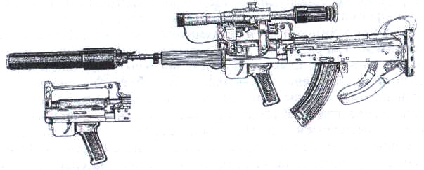 ОЦ-14 «ГРОЗА»Во время беспорядков в Чечне появились снимки, сделанные агентствами новостей, на которых были изображены военнослужащие российского Министерства внутренних дел, вооруженные оружием, по внешнему виду которого можно было предположить, что это модификация автомата Калашникова, выполненная по компоновке «булл-пап». Однако подробной информации о новой системе пришлось ждать довольно долго. Как выяснилось впоследствии, новый компактный автомат принадлежал к семейству оружия ОЦ-14 «Гроза». ОЦ-14 является в прямом смысле семейством оружия, поскольку в зависимости от конкретной необходимости на ее основе можно сделать автомат, имеющий одну из четырех конфигураций. Новая система оружия получила распространение в войсках МВД задолго до того, как им пришлось действовать в Чечне, но именно во время этого конфликта она впервые получила известность; впоследствии этот автомат взяла на вооружение частей специального назначения Российская армия. ОЦ-14 будет оставаться на вооружении войск российских Министерства обороны и МВД достаточно долго. Причины этого станут понятны, когда читатель ознакомится с настоящим разделом. История создания ОЦ-14 началась с мысли, выдвинутой Валерием Телешем, известным в первую очередь как создатель подствольных гранатометов ГП-25 и ГП-30. Телеш в полной мере оценил преимущества американского подствольного гранатомета М203, но решил, что это оружие обладает многими недостатками, не позволяющими эффективно использовать его в бою. Далеко не последний из недостатков заключался в том, что комбинация автоматической винтовки с гранатометом получалась очень громоздкой и тяжелой. Кроме того, Телеш считал, что добавление М203 нарушает балансировку винтовки, которой становится очень трудно пользоваться по прямому назначению. Поэтому он начал работу над созданием единой системы вооружения, обладающей всеми желаемыми качествами оружия для ближнего боя. В качестве отправной точки был взят стандартный автомат Калашникова. Телеш и конструктор по имени Юрий Лебедев начали работы над новым оружием в декабре 1992 года; меньше чем через год были готовы первые опытные образны, и уже в начале 1994 года ОН-14 был готов к серийному производству – примечательное достижение для такой сложной системы. Первоначально замысел состоял в том, чтобы сделать оружие, способное использовать боеприпасы четырех типов: 5,45x39 мм, 5,56x45 мм, 7,62x39 мм и 9x39 мм. Последний патрон используется в некоторых видах российского специального оружия и подробно описан в главе, посвященной боеприпасам. Система вооружения ОЦ-14 «Гроза». Вверху: Базовая модификация ОЦ-14-4А «Гроза». В центре: Специальный автомат ОЦ-14-4А-01 «Гроза». Внизу: Компактная модель ОЦ-14-4А «Гроза». Отдельные компоненты системы вооружения ОЦ-14-4А «Гроза». Модификация для выполнения специальных заданий ОЦ-14-4A-03 «Гроза». Базовая модификация ОЦ-14-4А «Гроза», вид слева. Видны переводчии режима «автомат – гранатомет» над спусковой скобой, холостая граната и граната ВОГ-25П. Базовая модификация ОЦ-14-4А «Гроза», вид справа. Модификация «Грозы» с укороченным стволом. ОЦ-14-4А-01 под патрон 9x39 мм. Компактная модификация системы ОЦ-14-4А-02 «Гроза». Модификация для выполнения специальных заданий ОЦ- I4-4A-03 «Гроза», вид с левой стороны. Телеш и Тульский оружейный завод были уверены, что создали замечательн
