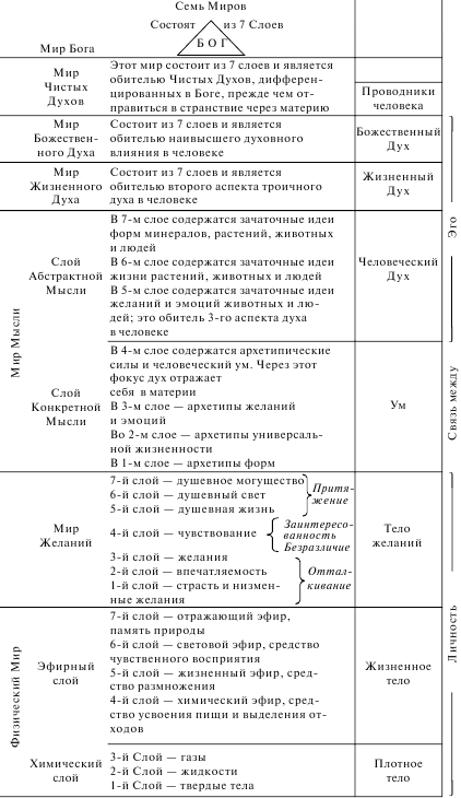 Диаграмма 1. Относительное постоянство видимого и невидимого миров (Иллюстрируется на примере со стереопроектором) Весь слой Абстрактной Мысли отражается в мире Желаний; мир Жизненного Духа — в Эфирном слое Физического мира; мир Божественного Духа — в Химическом слое Физического мира. Диаграмма 2 дает исчерпывающее представление о семи мирах, являющихся сферой нашего развития, но мы должны четко усвоить, что эти миры находятся не один над другим, как показано на диаграмме. Они пронизывают друг друга. Когда мы сравнили Физический мир с миром Желаний, мы уподобили мир Желаний силовым линиям в замерзающей воде, а саму воду — Физическому миру. Так же можно уподобить силовые линии любому из семи миров, тогда вода, как в нашем примере, соответствует ближайшему, более плотному миру. Следующая иллюстрация поможет прояснить этот предмет.